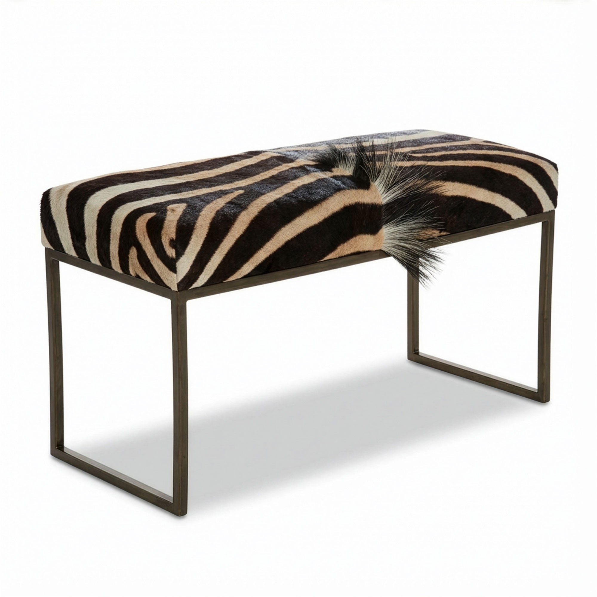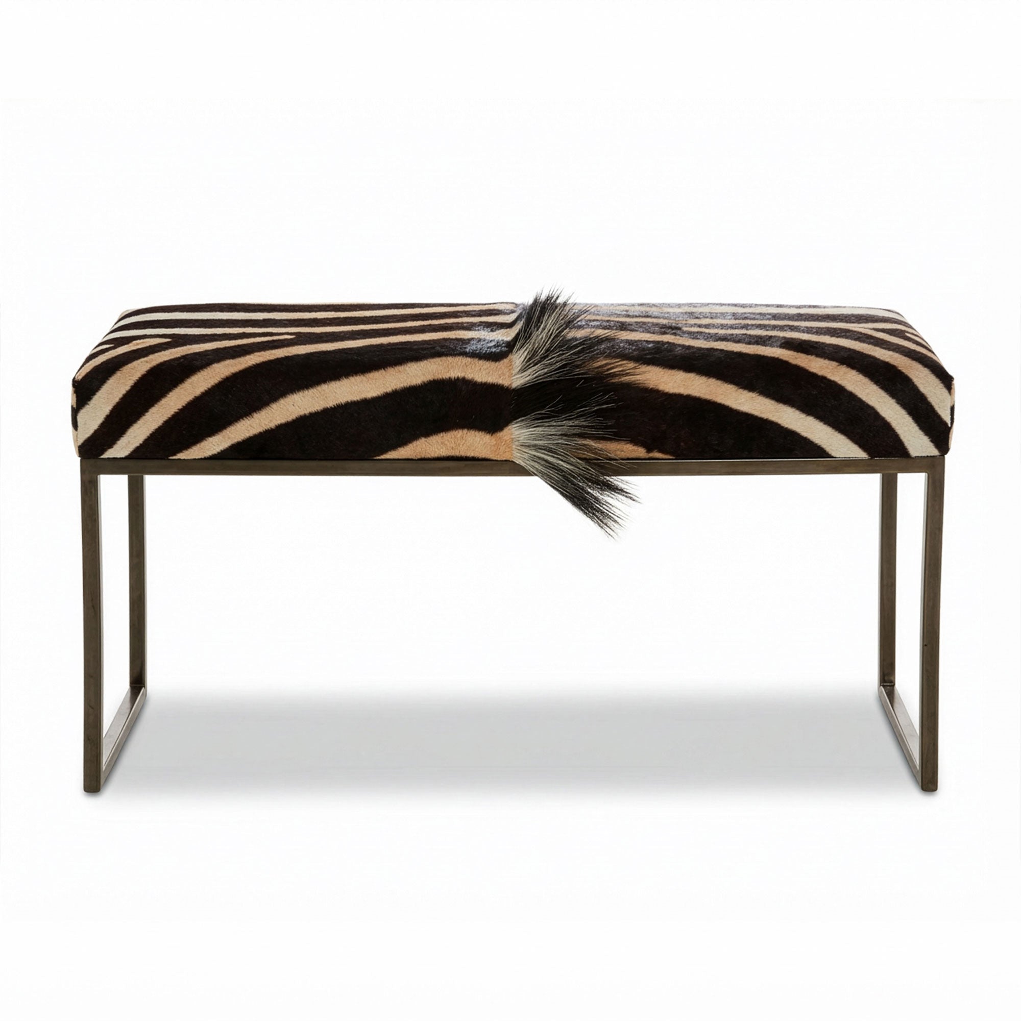 The African Burchell Zebra Metal Bench in black chrome is a stunning combination of natural beauty and modern design. Featuring authentic zebra hide upholstery and a sleek black chrome base, this bench brings elegance and sophistication to any space. Crafted with care, the zebra hide is sustainably sourced, ensuring a commitment to ethical and eco-conscious practices. Perfect for living rooms, entryways, or bedrooms, this bench is a luxurious and unique addition to your decor.
