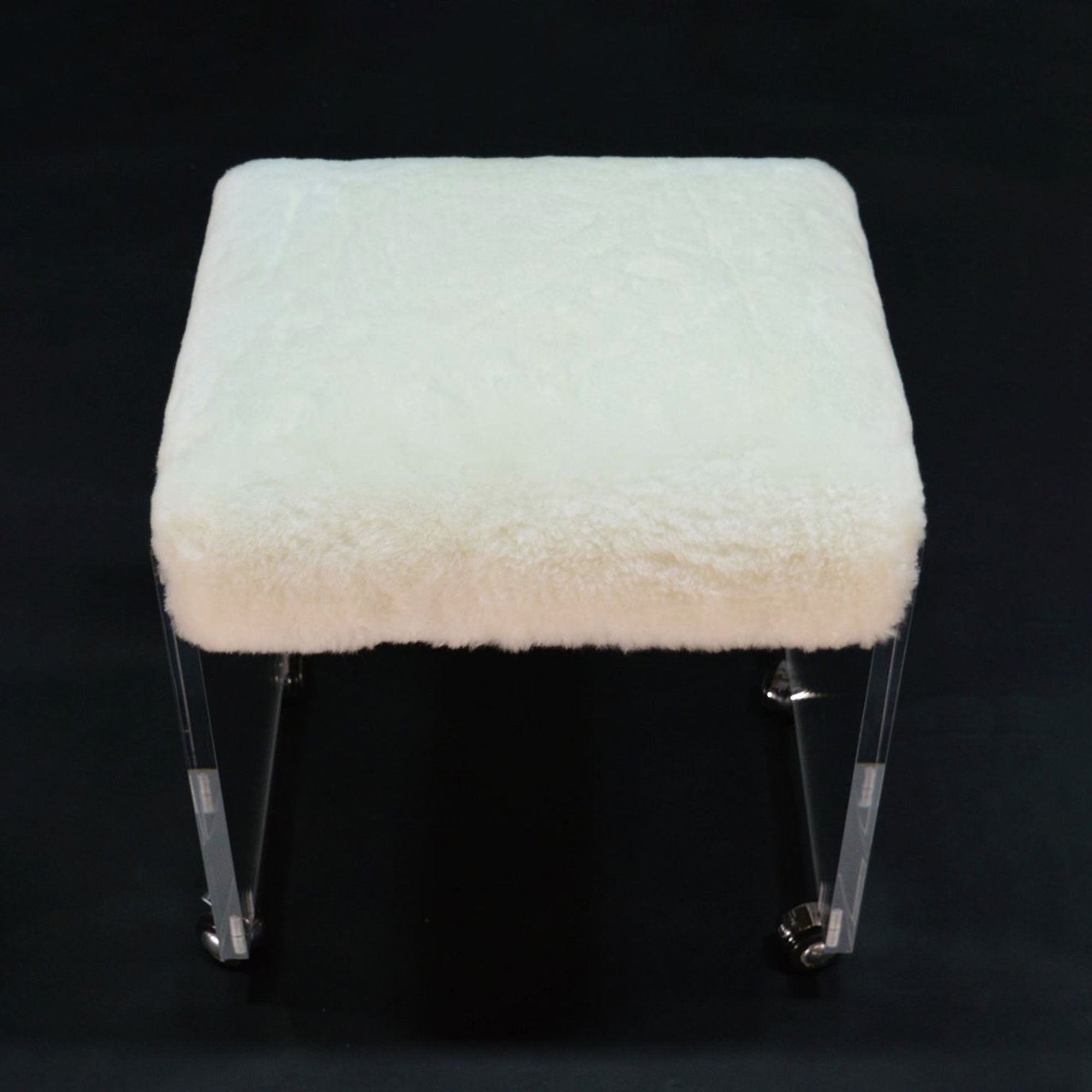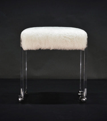 Made to order in Texas. A compact cube-style ottoman upholstered in genuine shearling sheepskin. Small enough to tuck beside a chair or use as a footrest, with the same plush texture as our larger pieces.