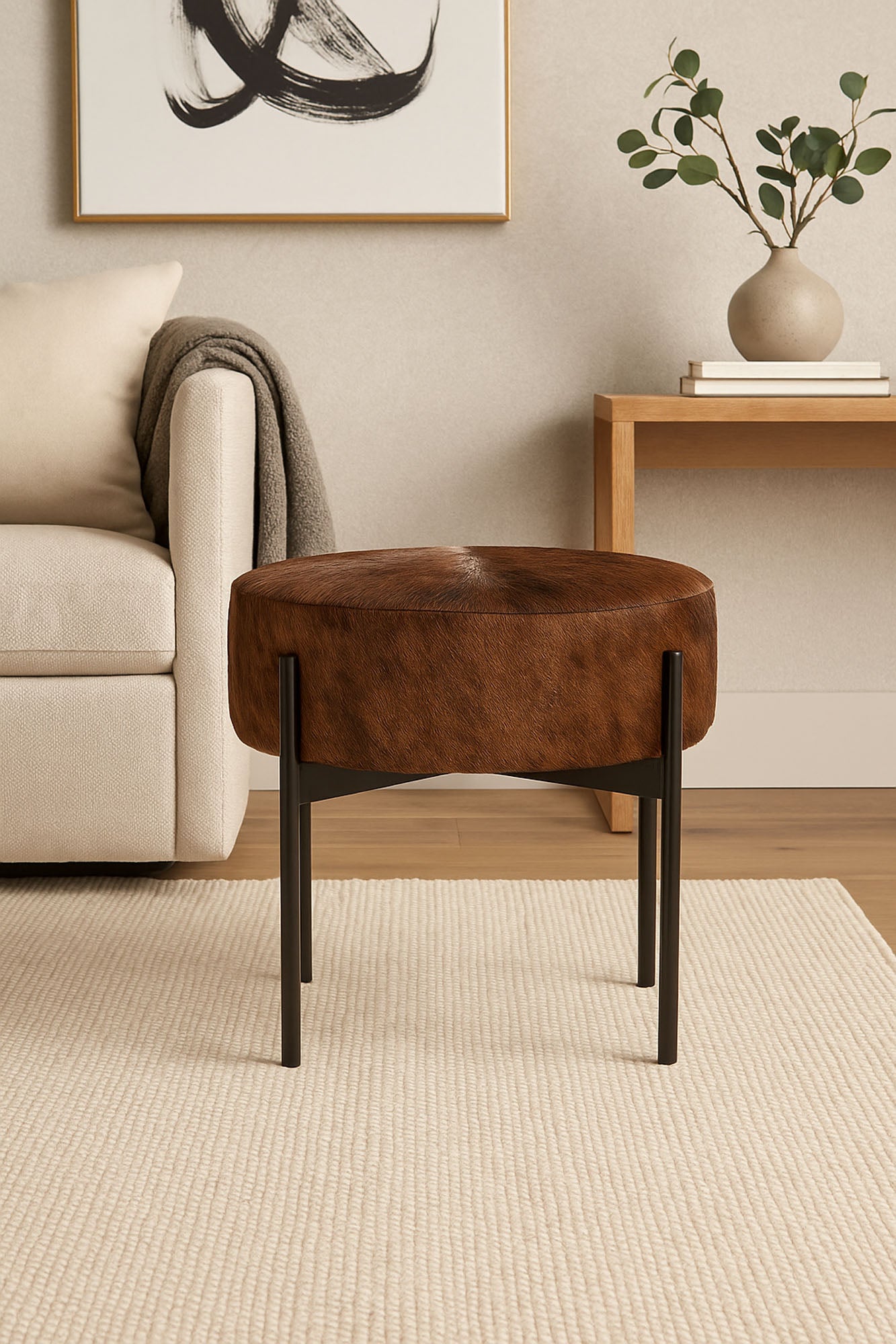 The Brown Cowhide Aria Bench in Matt Black combines rustic charm with modern style. The rich brown cowhide contrasts with the matte black frame, making it a versatile accent for living rooms, bedrooms, or entryways.
