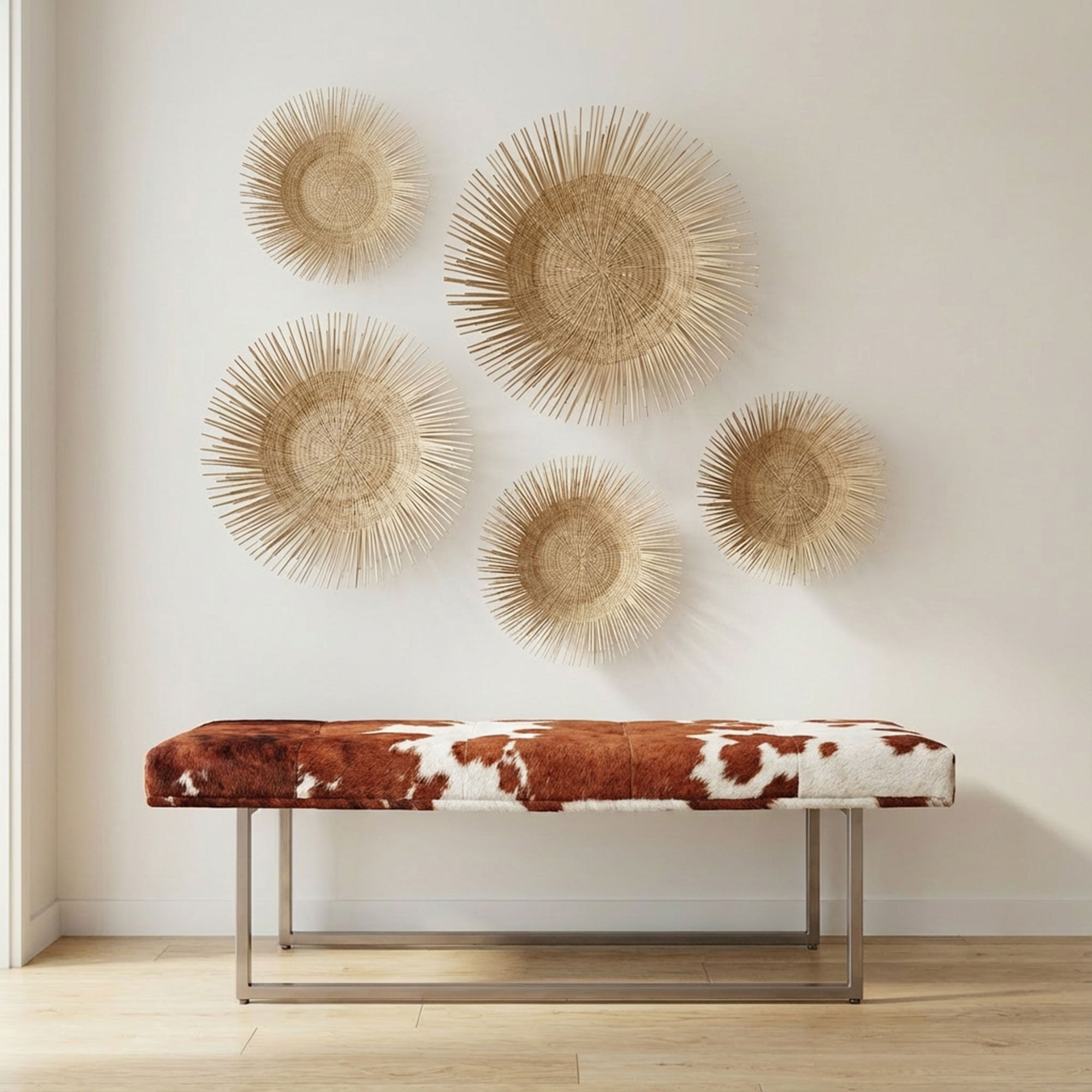 Elevate your decor with the Exotic Brown Cowhide Bellagio Bench in Pewter. The rich brown cowhide brings warmth and texture, while the pewter frame adds a modern edge. Perfect for living rooms, bedrooms, or entryways, this bench is a luxurious accent piece that complements any decor.