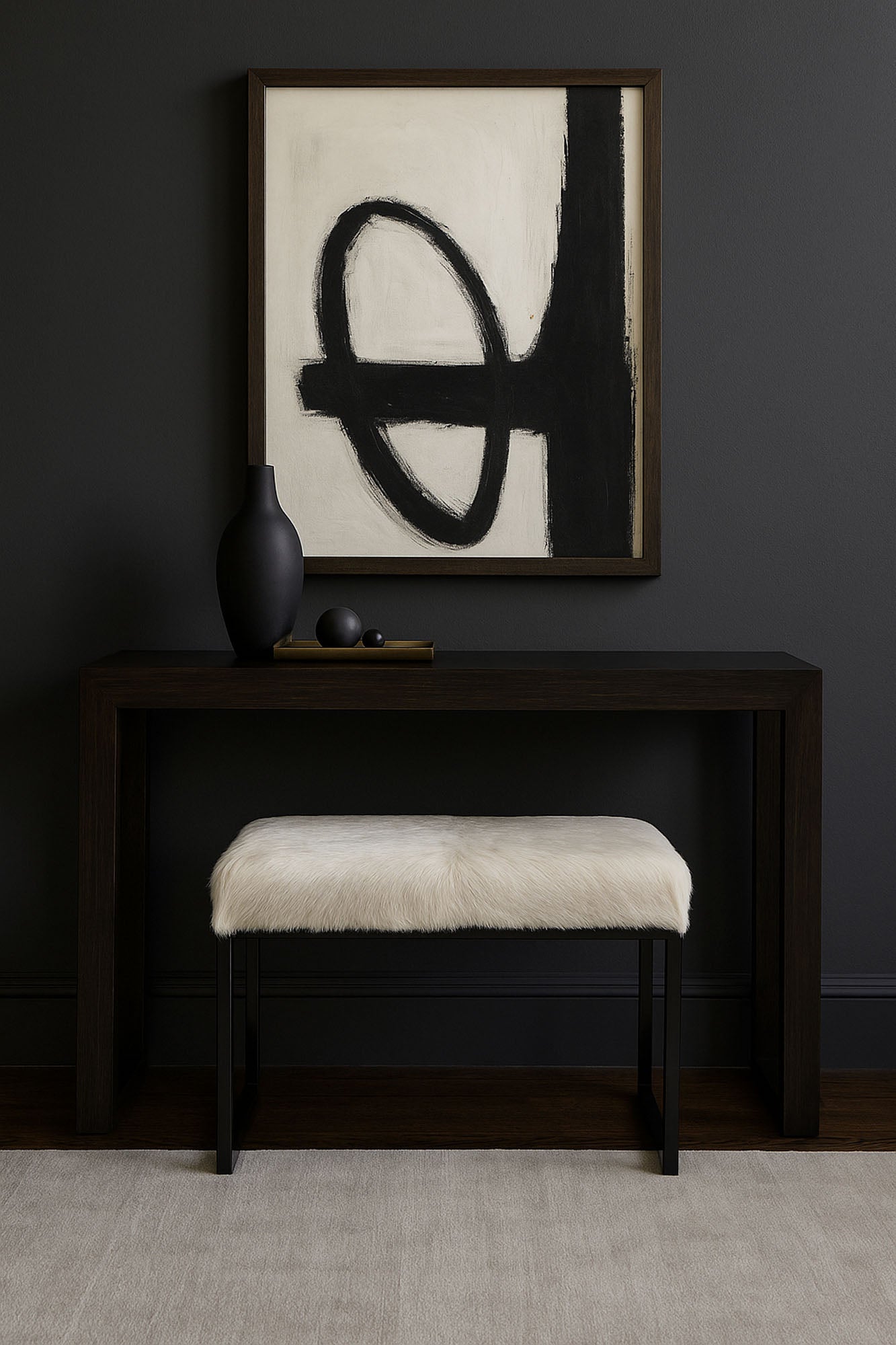 Elevate your decor with this Solid White Cowhide Bench in Matte Black. The clean, white cowhide contrasts beautifully with the matte black frame, creating a chic, modern look that complements living rooms, entryways, or bedrooms. This bench is a versatile statement piece, combining refined style with high-quality materials for lasting elegance.
