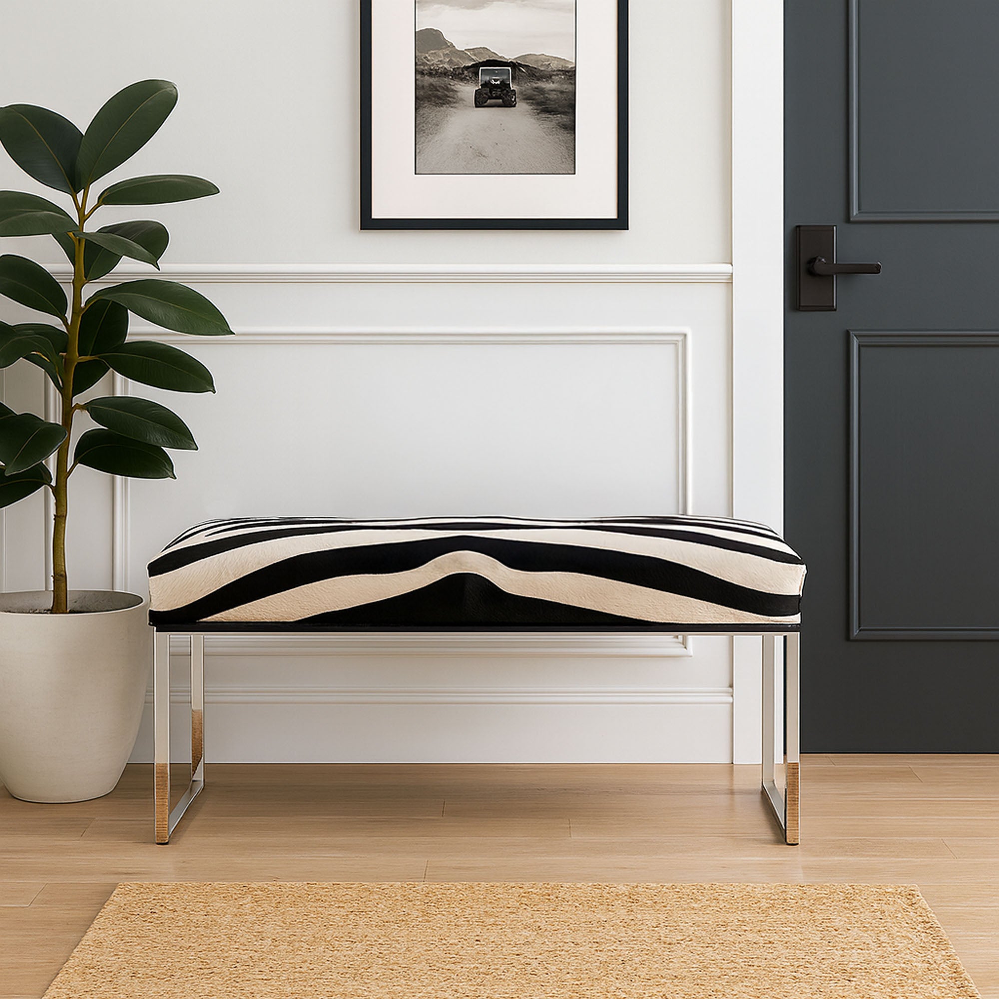Bring an exotic touch to your decor with this Stencil Zebra Cowhide Bench in Chrome. The striking zebra stencil pattern on genuine cowhide pairs with the sleek chrome frame, making it a standout piece for living rooms, entryways, or bedrooms. This bench combines high-quality materials with an eye-catching design for a modern and stylish accent.
