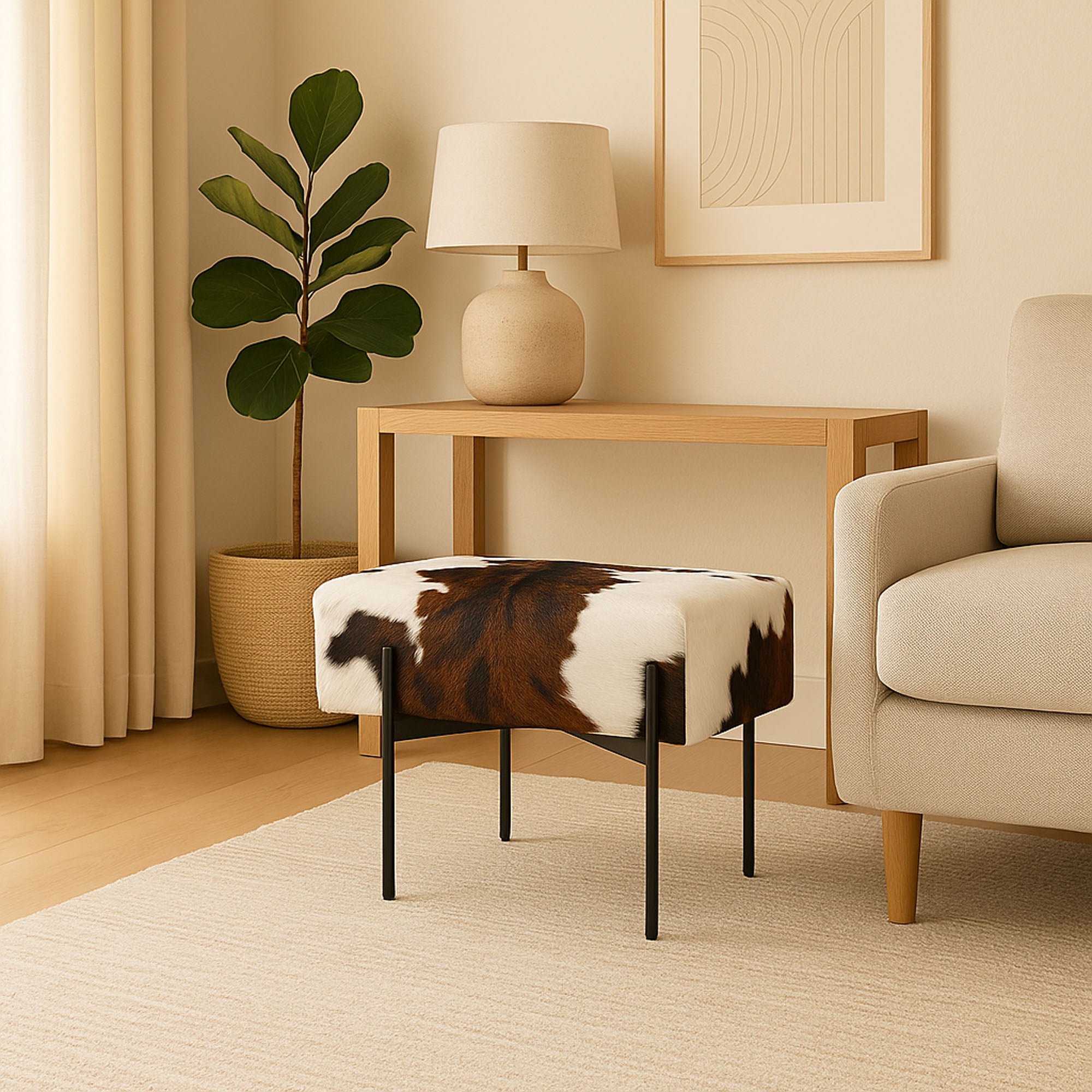 Make a statement with the Tri-Color Cowhide Aria Bench in Matte Black. Featuring a unique blend of natural cowhide colors—brown, white, and black—this bench brings texture and vibrancy to any room. The matte black frame enhances its modern appeal, making it a versatile accent for living rooms, bedrooms, or entryways. Perfect for those looking to add a touch of style and sophistication to their decor.