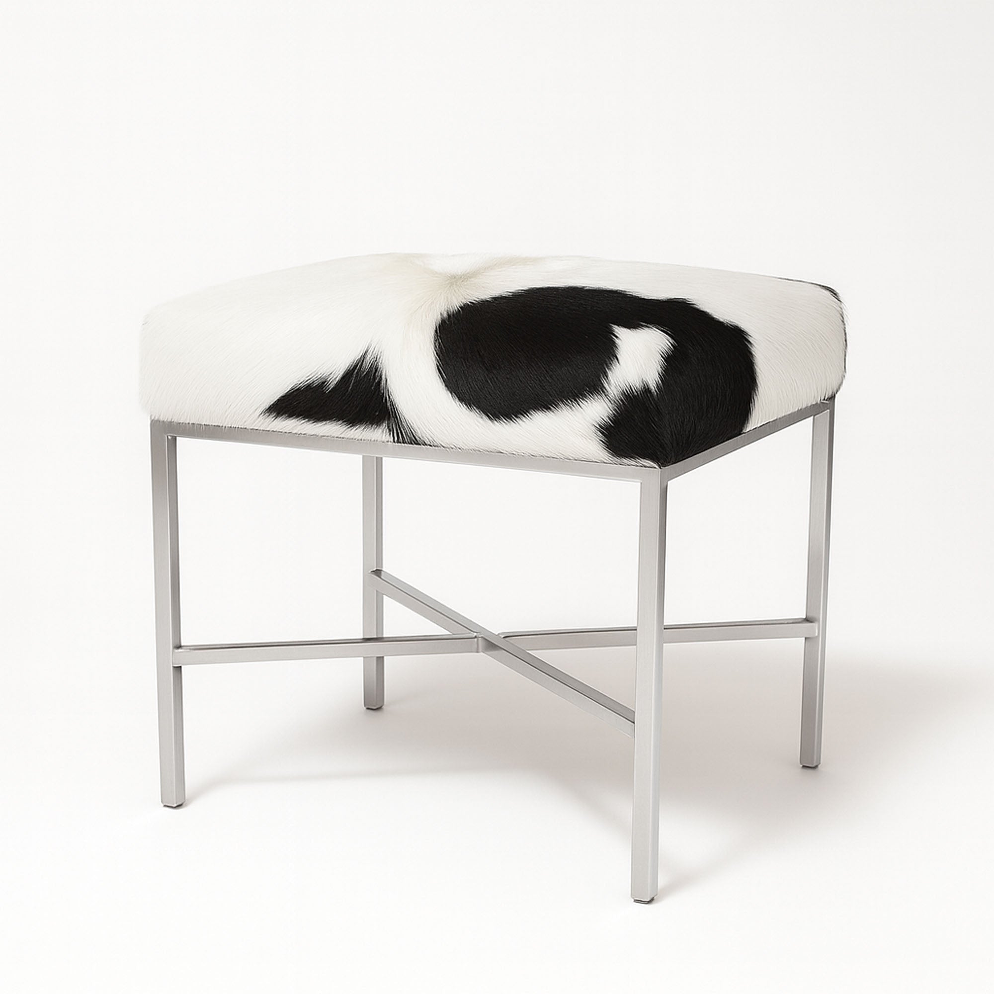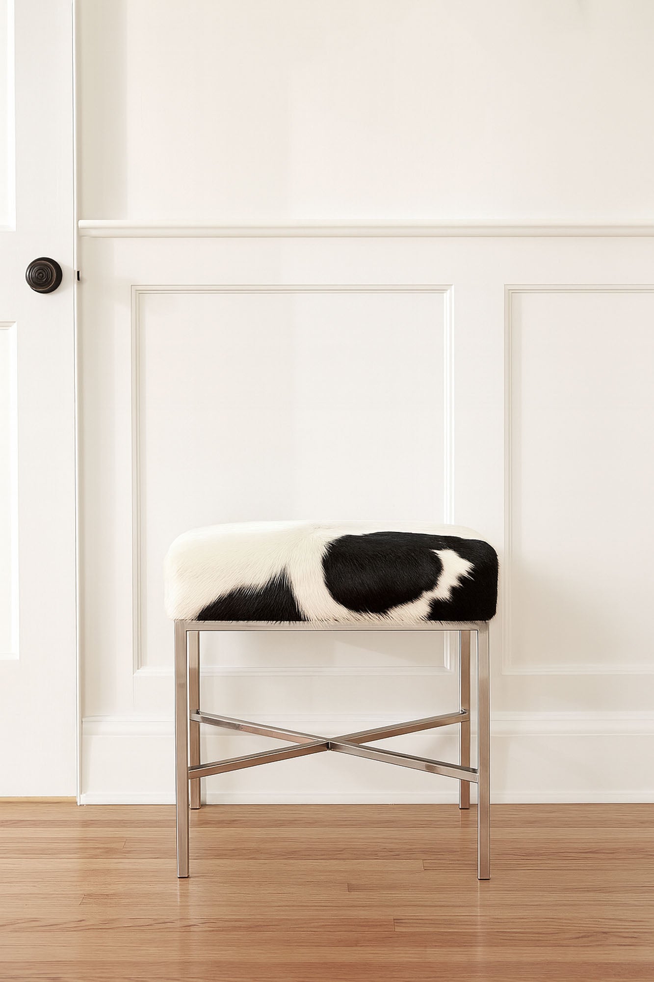Elevate your space with this White and Black Cowhide Bench, featuring a sleek chrome metal frame. The natural cowhide pattern adds a modern rustic charm, making it perfect for living rooms, entryways, or bedrooms. Each bench is unique, adding a one-of-a-kind touch to your decor.