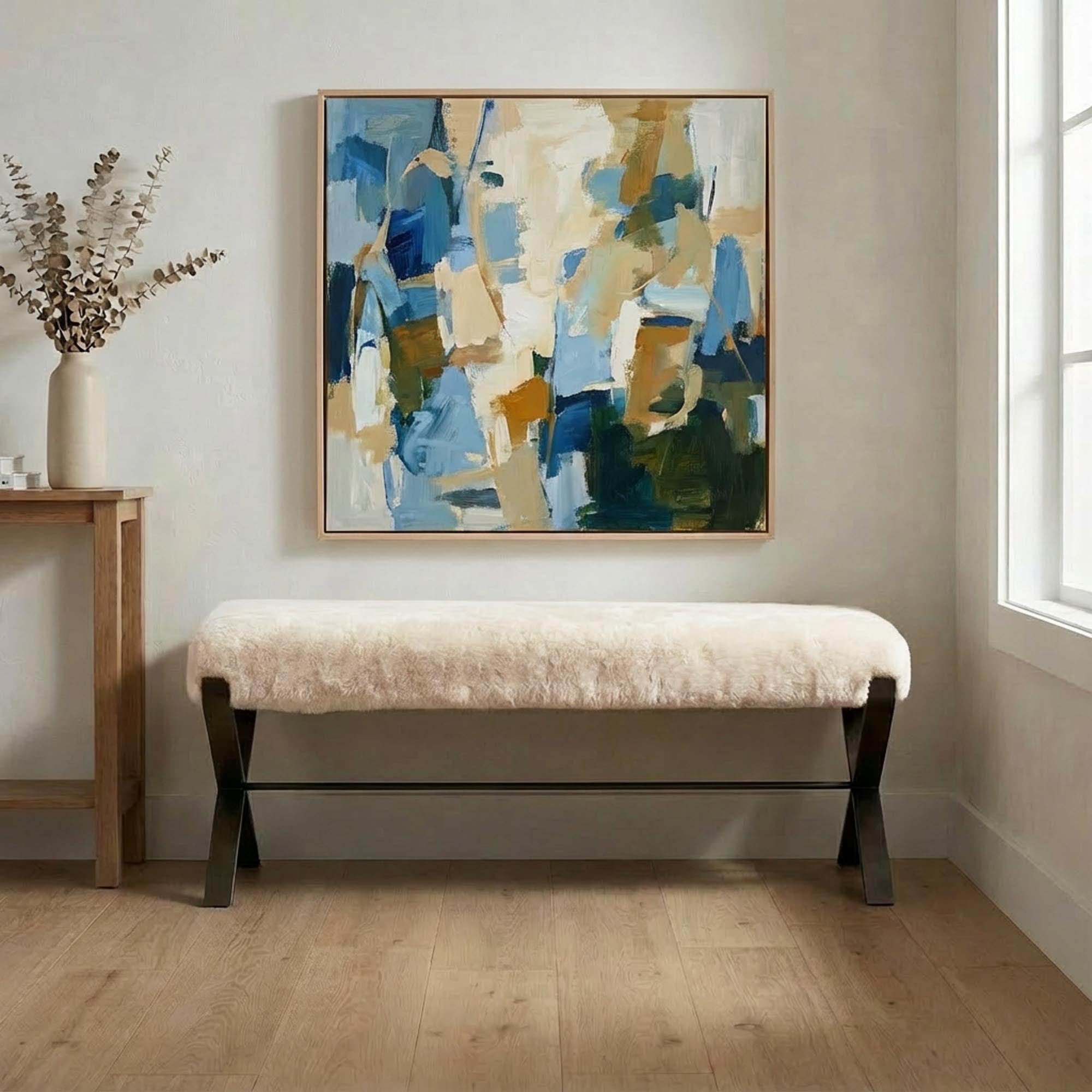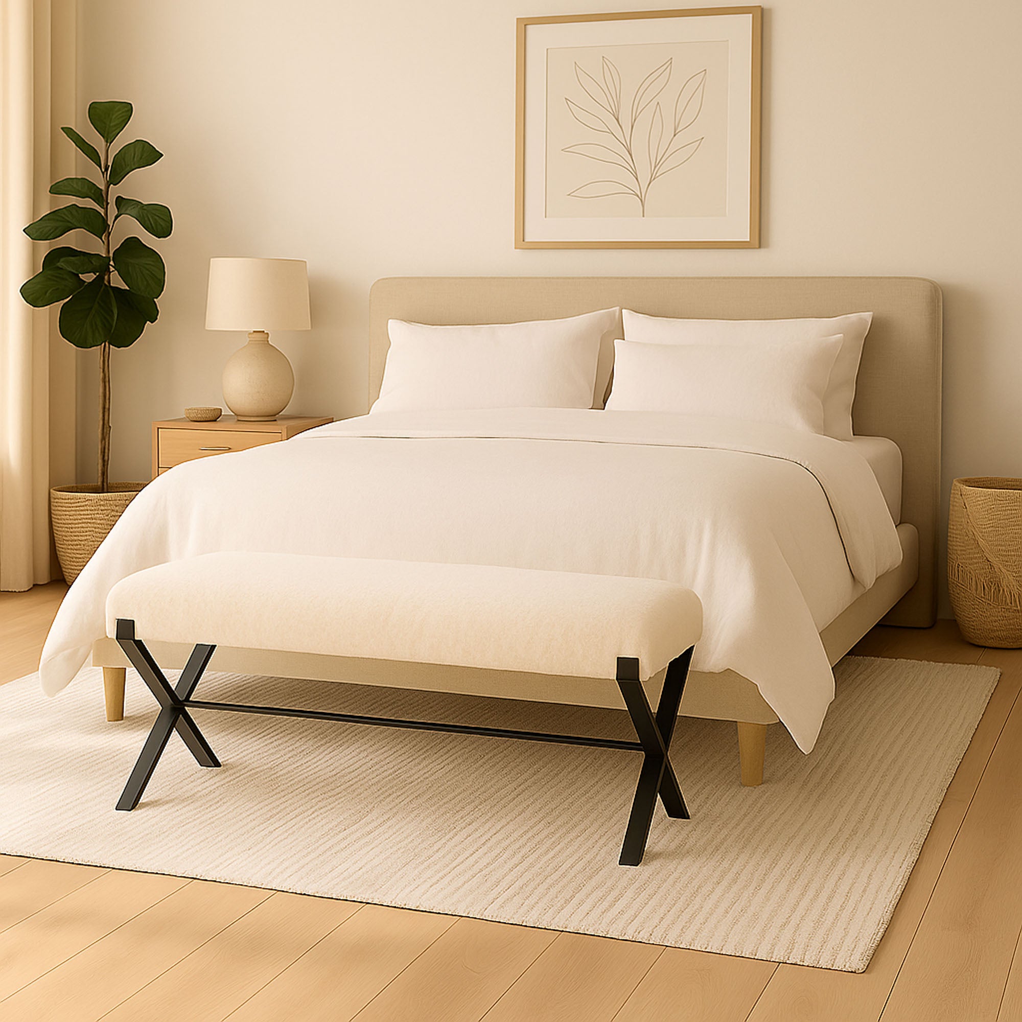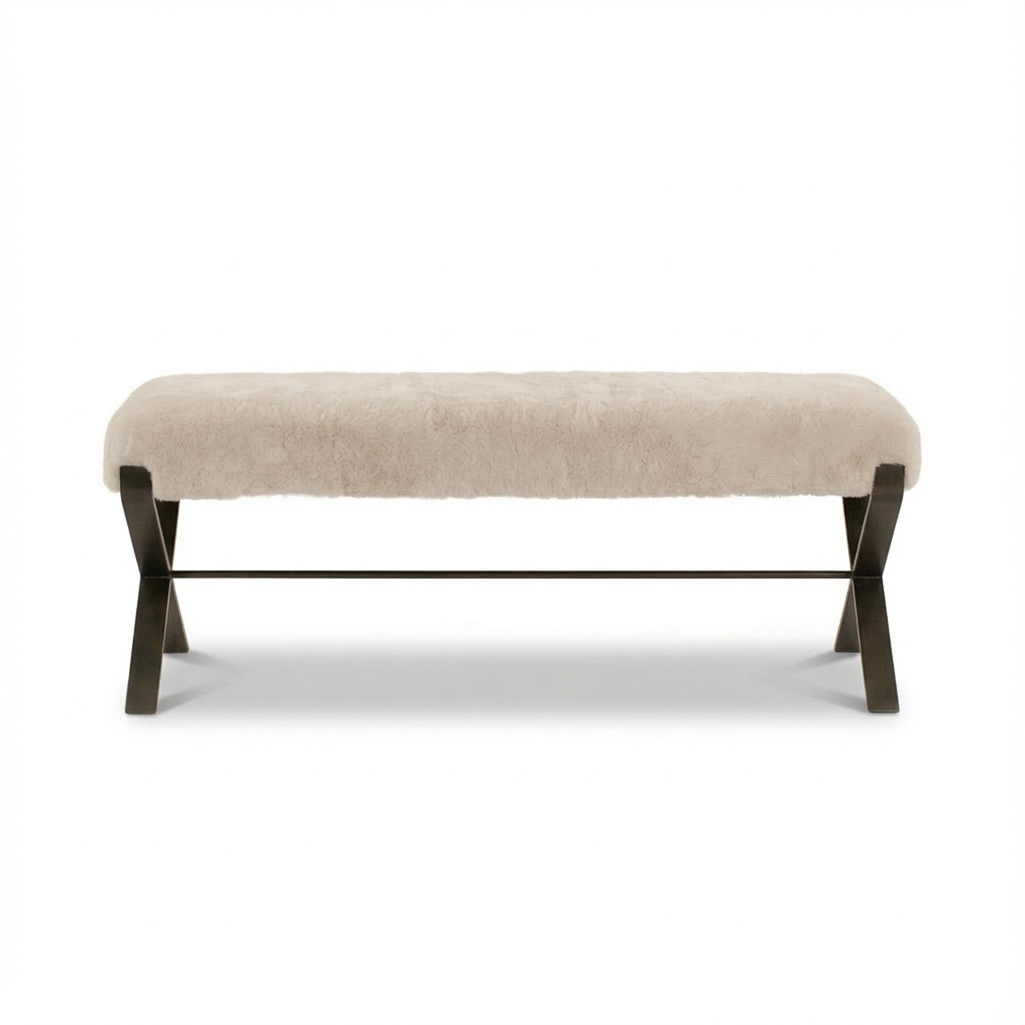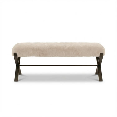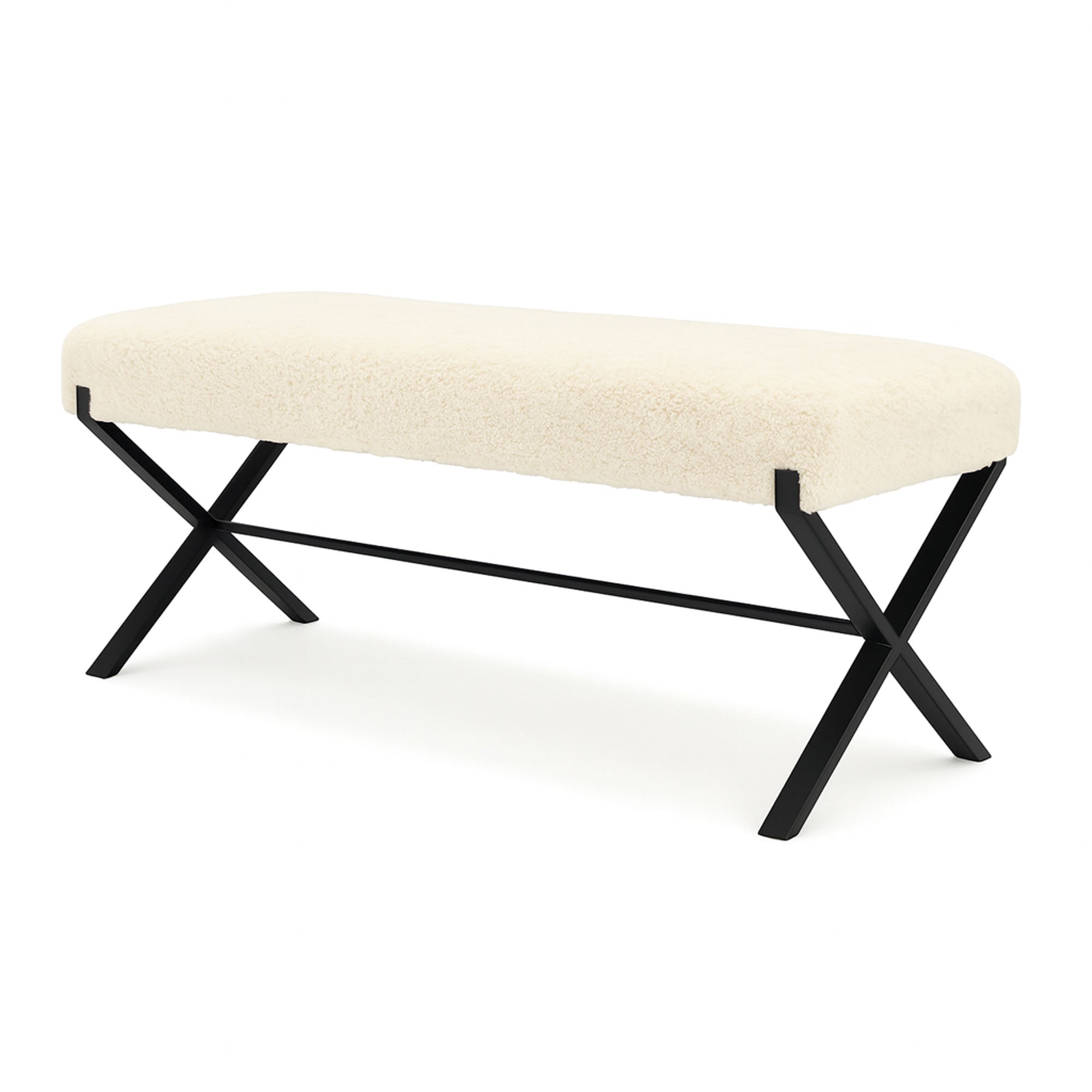 The White Shearling Sheepskin Hawadii Bench in matt black pairs plush shearling upholstery with a sleek black base, creating a bold and modern aesthetic. Perfect for living rooms, bedrooms, or entryways, this bench is a true statement piece.