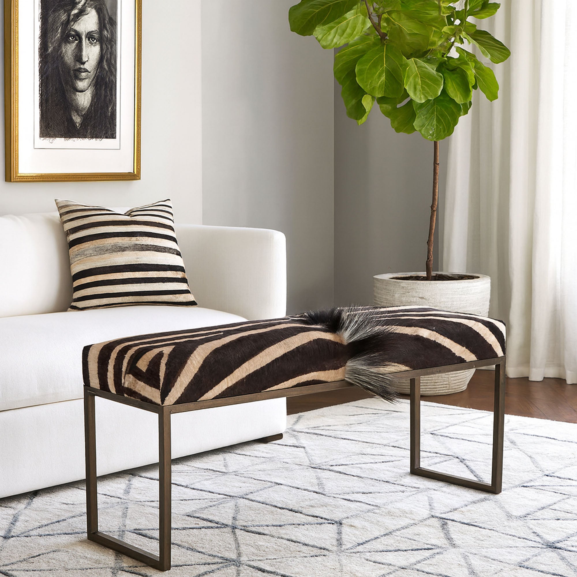The African Burchell Zebra Metal Bench in black chrome is a stunning combination of natural beauty and modern design. Featuring authentic zebra hide upholstery and a sleek black chrome base, this bench brings elegance and sophistication to any space. Crafted with care, the zebra hide is sustainably sourced, ensuring a commitment to ethical and eco-conscious practices. Perfect for living rooms, entryways, or bedrooms, this bench is a luxurious and unique addition to your decor.